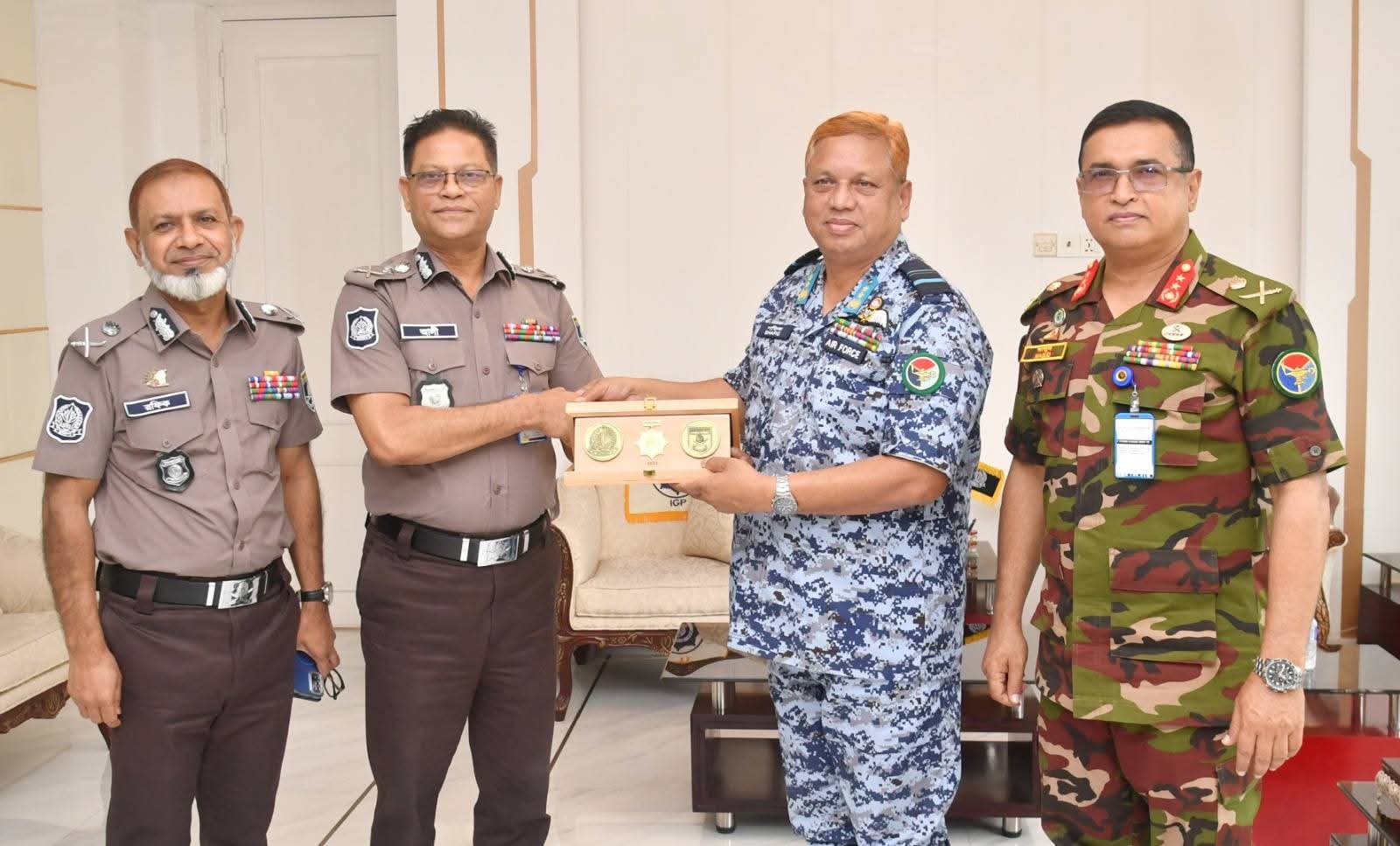 পরিদর্শনকালে ইন্সপেক্টর জেনারেল অব পুলিশ (আইজিপি), বাংলাদেশ মোঃ আলী হোসেন ফকির এর সঙ্গে প্রতিনিধিদলের প্রধান এয়ার ভাইস মার্শাল মোঃ শফিকুল ইসলাম সৌজন্য সাক্ষাৎ করেন। এসময় উভয়ে শুভেচ্ছা স্মারক বিনিময় করেন।