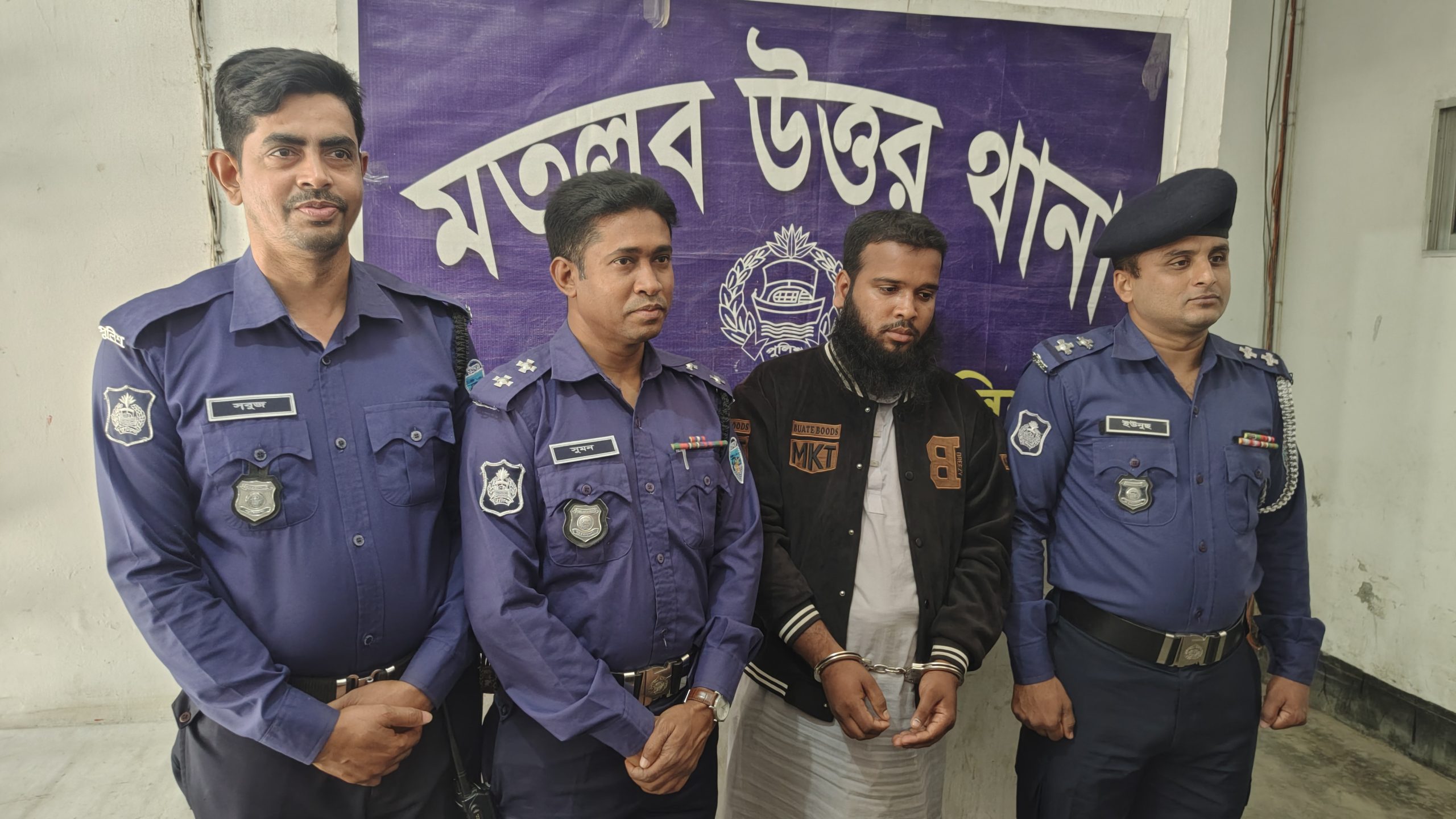 মতলব উত্তর থানায় সাংবাদিক সম্মেলনে শাকিলা আক্তার হত্যা মামলার রহস্য উদঘাটন ও প্রধান আসামি গ্রেপ্তারের বিষয়ে বক্তব্য দিচ্ছেন সহকারী পুলিশ সুপার জাবির হুসনাইন সানীব।