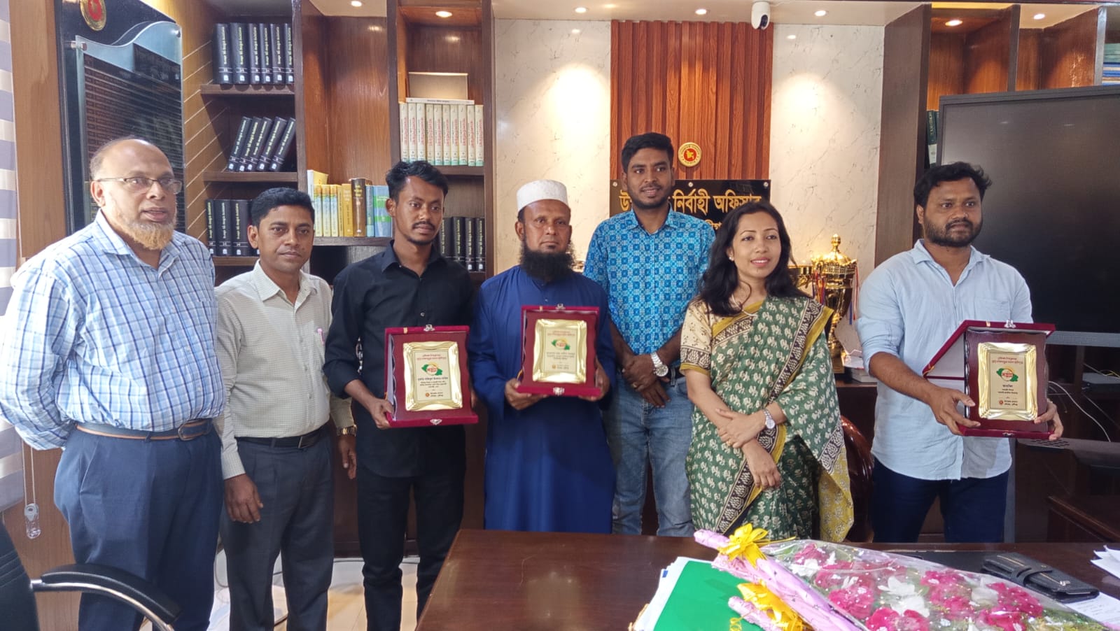 সম্মাননা স্মারক তুলে দেন উপজেলা নির্বাহী কর্মকর্তা ফারজানা ববি মিতু, উপজেলা প্রাণিসম্পদ কর্মকর্তা ডা. শ্যামল চন্দ্র পোদ্দার, উপজেলা প্রকৌশলী মো. রেজাউল ইসলাম ও সমাজ সেবা অফিসার উজ্জ্বল মুন্সি প্রমূখ।